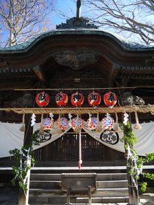 拝殿に参る。拝殿も幕と提灯で飾り付けられている。