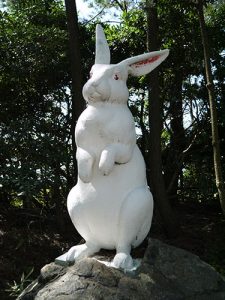 七面堂の前に白うさぎの像が立っている。「因幡の白うさぎ」は神話として有名だが、氣多大社にも「能登の白うさぎ」の伝説が伝わる。