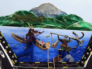 出発を待つ酒垂神社の曳山です。今年のテーマは源平合戦壇ノ浦。