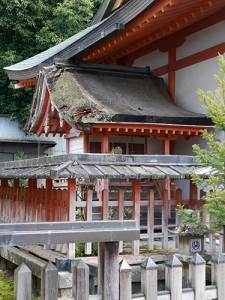 拝殿背後に唐門付きの本殿。拝殿、弊殿、唐門、本殿と並び、すべて檜皮葺の屋根で重要文化財になっている。